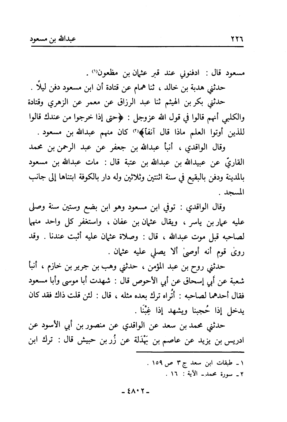 حدثني محمد بن سعد عن الواقدي عن منصور بن أبي الأسود عن إدريس بن يزيد عَنْ عَاصِمِ بْنِ بَهْدَلَةَ عَنْ زِرِّ بْنِ حبيش قال: ترك ابن