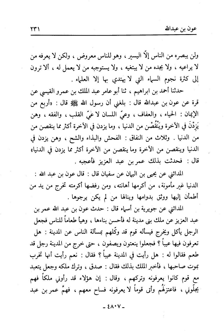 حَدَّثَنَا أَحْمَدُ بْنُ إِبْرَاهِيمَ، ثنا أَبُو عَامِرٍ عَبْدُ الْمَلِكِ بْنُ عَمْرٍو الْقَيْسِيُّ عَنْ قُرَّةَ عَنْ عَوْنِ بْنِ عَبْدِ اللَّهِ قَالَ: بَلَغَنِي أَنَّ رَسُولَ اللَّهِ صَلَّى اللَّهُ عَلَيْهِ وَسَلَّمَ قَالَ: « [أَرْبَعٌ مِنَ الإِيمَانِ: الْحَيَاءُ، وَالْعَفَافُ، وَعِيُّ اللِّسَانِ لا عِيَّ الْقَلْبِ، وَالْفِقْهُ، وَهُنَّ يَزِدْنَ فِي الآخِرَةِ وَيَنْقُصْنَ مِنَ الدُّنْيَا، وَمَا يَزِدْنَ فِي الآخِرَةِ أَكْثَرُ مِمَّا ينقصن من مِنَ الدُّنْيَا. وَثَلاثٌ مِنَ النِّفَاقِ: الْفُحْشُ وَالْبَذَاءُ وَالشُّحُّ، وَهُنَّ يَزِدْنَ فِي الدُّنْيَا وَيَنْقُصْنَ مِنَ الآخِرَةِ وَمَا يَنْقُصْنَ مِنَ الآخِرَةِ أَكْثَرُ مِمَّا يَزِدْنَ فِي الدُّنْيَا] » قَالَ: فَحَدَّثْتُ بِذَلِكَ عُمَرَ بْنَ عَبْدِ الْعَزِيزِ فَأَعْجَبَهُ.