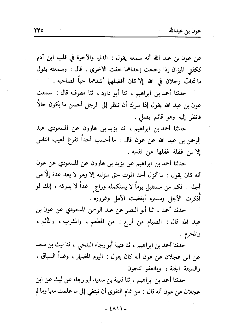 حدثنا أحمد بن إبراهيم، ثنا قتيبة بن سعيد أبو رجاء عن ليث عن ابن عجلان عن عون أنه قال: من تمام التقوى أن تبتغي إلى ما علمت منها وما لم