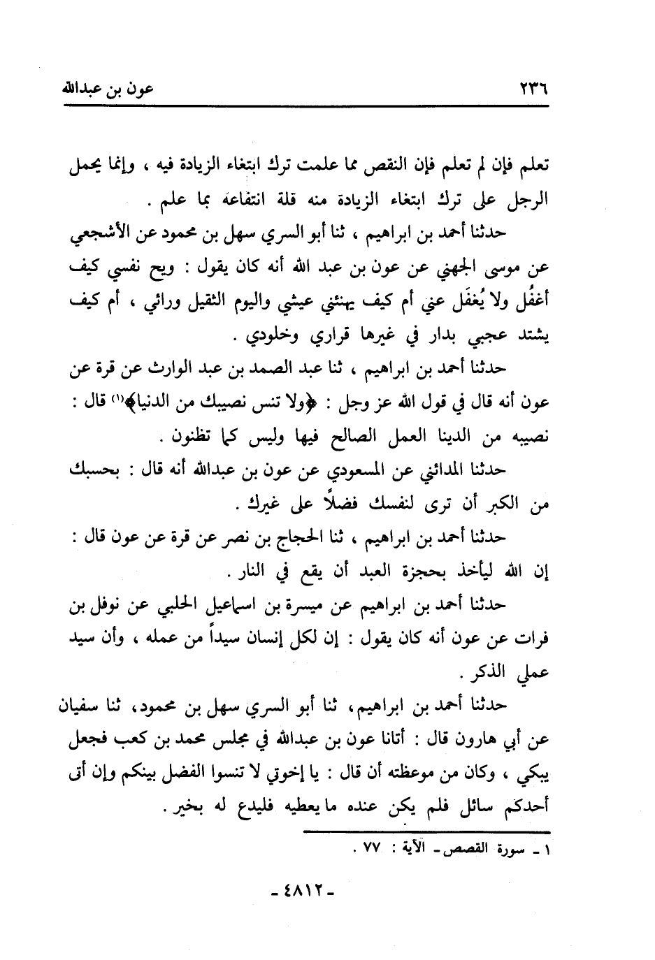 حدثنا أحمد بن إبراهيم، ثنا عبد الصمد بن عبد الوارث عن قرة عن عون أنه قال في قول الله عز وجل: ولا تنس نصيبك من الدنيا [1] قال: