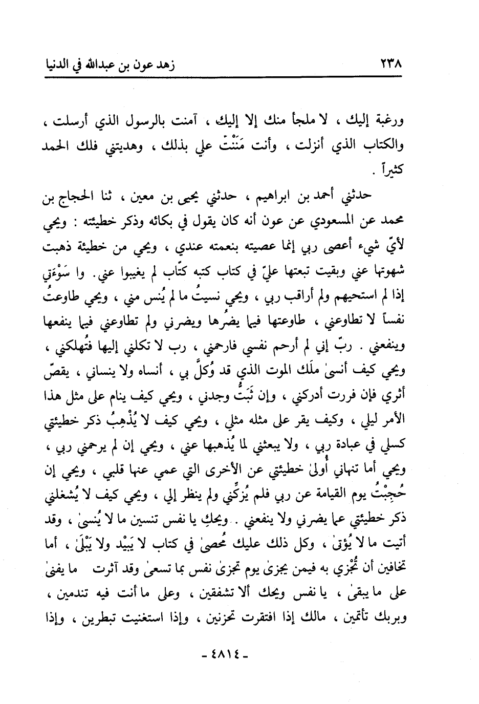 حدثني أحمد بن إبراهيم، حدثني يحيى بن معين، ثنا الحجاج بن محمد عن المسعودي عن عون أنه كان يقول في بكائه وذكر خطيئته: ويحي لأي شيء أعصى ربي إنما عصيته بنعمته عندي، ويحي من خطيئة ذهبت شهوتها عني وبقيت تبعتها علي في كتاب كتبه كتاب لم يغيبوا عني. وا سوءتي إذا لم استحيهم ولم أراقب ربي، ويحي نسيت ما لم ينس مني، ويحي طاوعت نفسا لا تطاوعني، طاوعتها فيما يضرها ويضرني ولم تطاوعني فيما ينفعها وينفعني. رب إني لم أرحم نفسي فارحمني، رب لا تكلني إليها فتهلكني، ويحي كيف أنسى ملك الموت الذي قد وكل بي، أنساه ولا ينساني، يقص أثري فإن فررت أدركني، وإن ثبت وجدني، ويحي كيف ينام على مثل هذا الأمر ليلي، وكيف يقر على مثله مثلي، ويحي كيف لا يذهب ذكر خطيئتي كسلي في عبادة ربي، ولا يبعثني لما يذهبها عني، ويحي إن لم يرحمني ربي، ويحي أما تنهاني أولى خطيئتي عن الأخرى التي عمي عنها قلبي، ويحي إن حجبت يوم القيامة عن ربي فلم يزكني ولم ينظر إلي، ويحي كيف لا يشغلني ذكر خطيئتي عما يضرني ولا ينفعني. ويحك يا نفس تنسين ما لا ينسى، وقد أتيت ما لا يؤتى، وكل ذلك عليك محصى في كتاب لا يبيد ولا يبلى، أما تخافين أن تجزي به فيمن يجزى يوم تجزى نفس بما تسعى وقد آثرت ما يفنى على ما يبقى، يا نفس ويحك ألا تشفقين، وعلى ما أنت فيه تندمين، وبربك تأتمين، مالك إذا افتقرت تحزنين، وإذا استغنيت تبطرين، وإذا