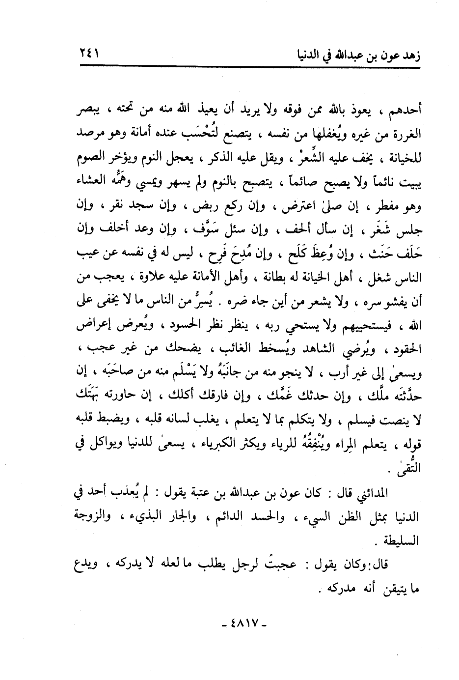 أحدهم، يعوذ بالله ممن فوقه ولا يريد أن يعيذ الله منه من تحته، يبصر الغررة من غيره ويغفلها من نفسه، يتصنع لتحسب عنده أمانة وهو مرصد للخيانة، يخف عليه الشعر، ويقل عليه الذكر، يعجل النوم ويؤخر الصوم يبيت نائما ولا يصبح صائما، يتصبح بالنوم ولم يسهر ويمسي وهمه العشاء وهو مفطر، إن صلى اعترض، وإن ركع ربض، وإن سجد نقر، وإن جلس شغر، إن سأل ألحف، وإن سئل سوف، وإن وعد أخلف وإن حلف حنث، وإن وعظ كلح، وإن مدح فرح، ليس له في نفسه عن عيب الناس شغل، أهل الخيانة له بطانة، وأهل الأمانة عليه علاوة، يعجب من أن يفشو سره، ولا يشعر من أين جاء ضره. يسر من الناس ما لا يخفى على الله، فيستحييهم ولا يستحي ربه، ينظر نظر الحسود، ويعرض إعراض الحقود، ويرضي الشاهد ويسخط الغائب، يضحك من غير عجب، ويسعى إلى غير أرب، لا ينجو منه من جانبه ولا يسلم منه من صاحبه، إن حدثته ملك، وإن حدثك غمك، وإن فارقك أكلك، إن حاورته بهتك لا ينصت فيسلم، ولا يتكلم بما لا يتعلم، يغلب لسانه قلبه، ويضبط قلبه قوله، يتعلم المراء وينفقه للرياء ويكثر الكبرياء، يسعى للدنيا ويواكل في التقى.