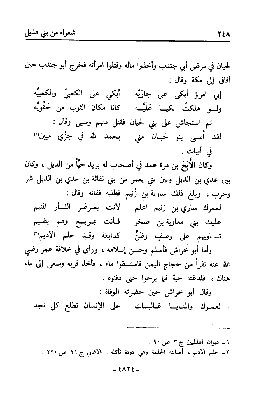 [2] وأما أبو خراش فأسلم وحسن إسلامه، ورأى في خلافة عمر رضي الله عنه نفرا من حجاج اليمن فاستسقوا ماء، فأخذ قربه وسعى إلى ماء هناك، فلدغته حية فما برحوا حتى دفنوه.