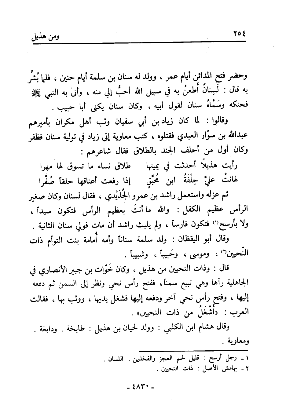 ثم عزله واستعمل راشد بن عمرو الجنيدي، فقال لسنان وكان صغير الرأس عظيم الكفل: والله ما أنت بعظيم الرأس فتكون سيدا، ولا بأرسح [1] فتكون فارسا، ولم يلبث راشد أن مات فولي سنان الثانية.