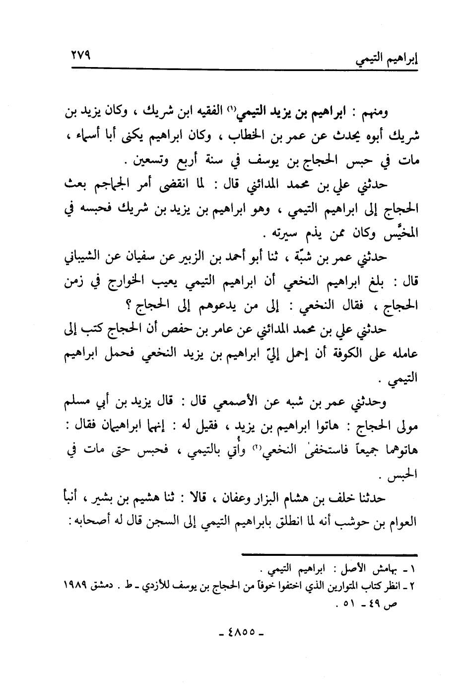 حَدَّثَنِي عُمَرُ بْنُ شَبَّةَ، ثنا أَبُو أَحْمَدَ بن الزبير عن سفيان عن الشيباني قال: بلغ إبراهيم النخعي أن إبراهيم التيمي يعيب الخوارج في زمن الحجاج، فقال النخعي: إلى من يدعوهم إلى الحجاج؟