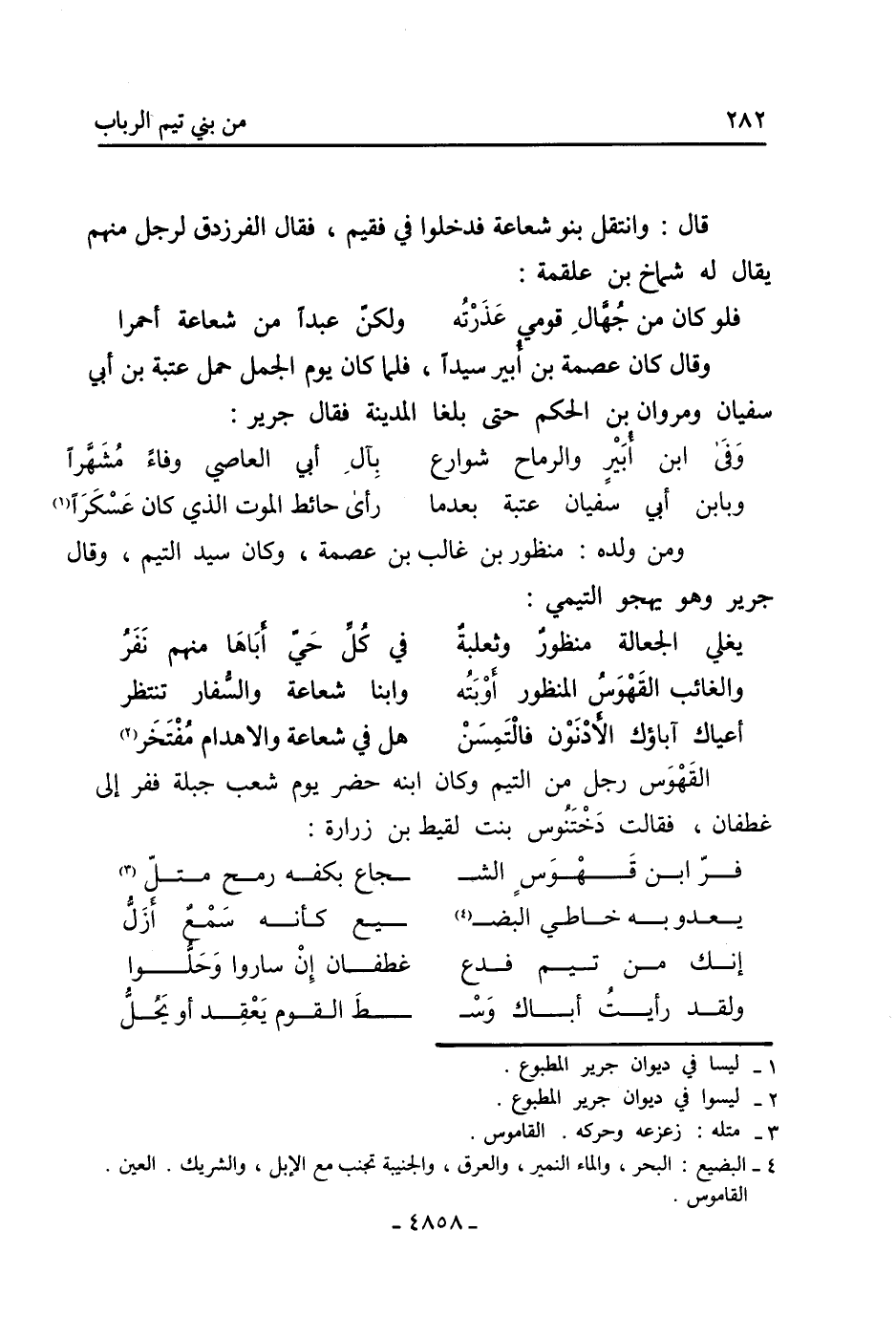 [2] القهوس رجل من التيم وكان ابنه حضر يوم شعب جبلة ففر إلى غطفان، فقالت دختنوس بنت لقيط بن زرارة:
