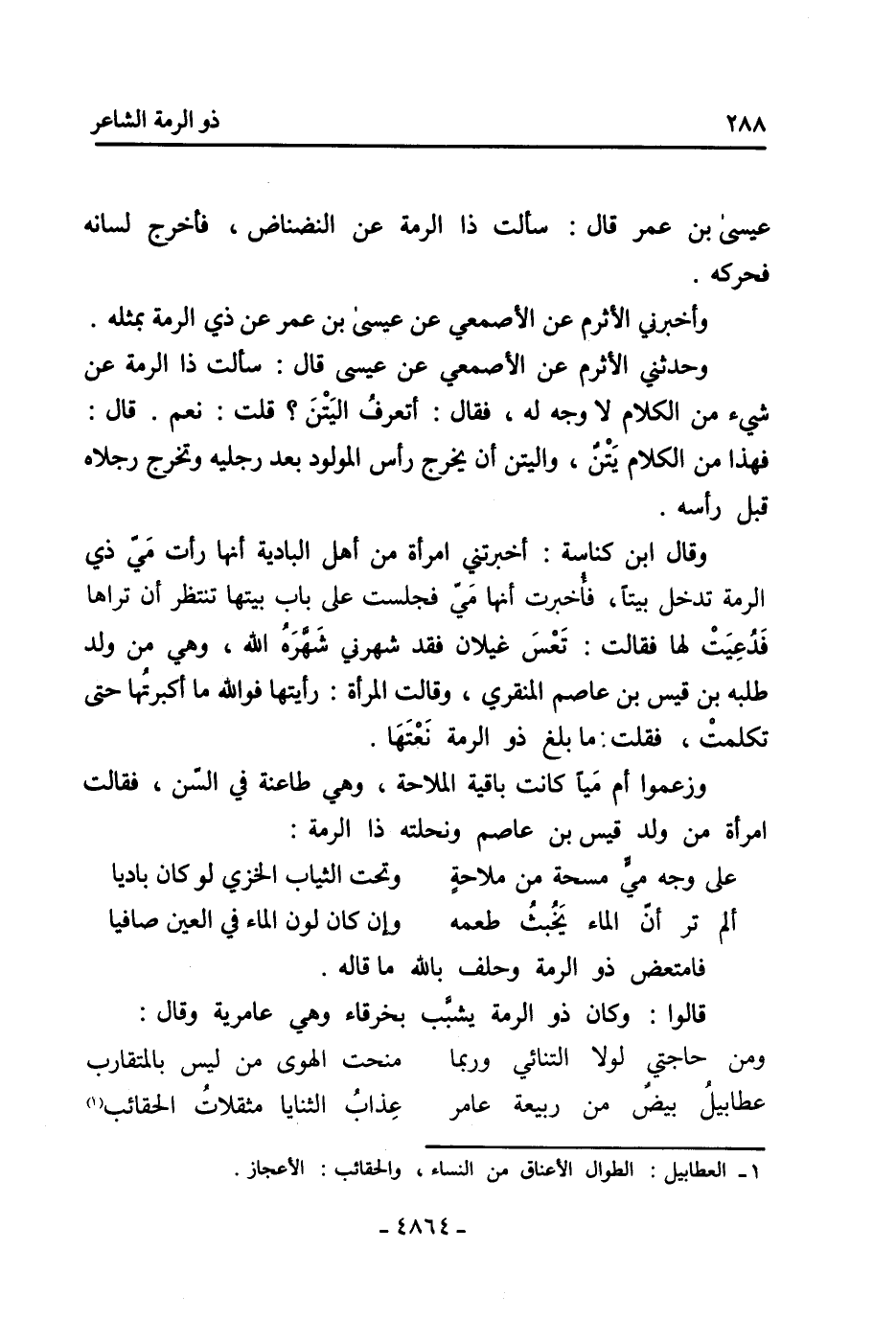 وحدثني الأثرم عن الأصمعي عن عيسى قال: سألت ذا الرمة عن شيء من الكلام لا وجه له، فقال: أتعرف اليتن؟ قلت: نعم. قال: