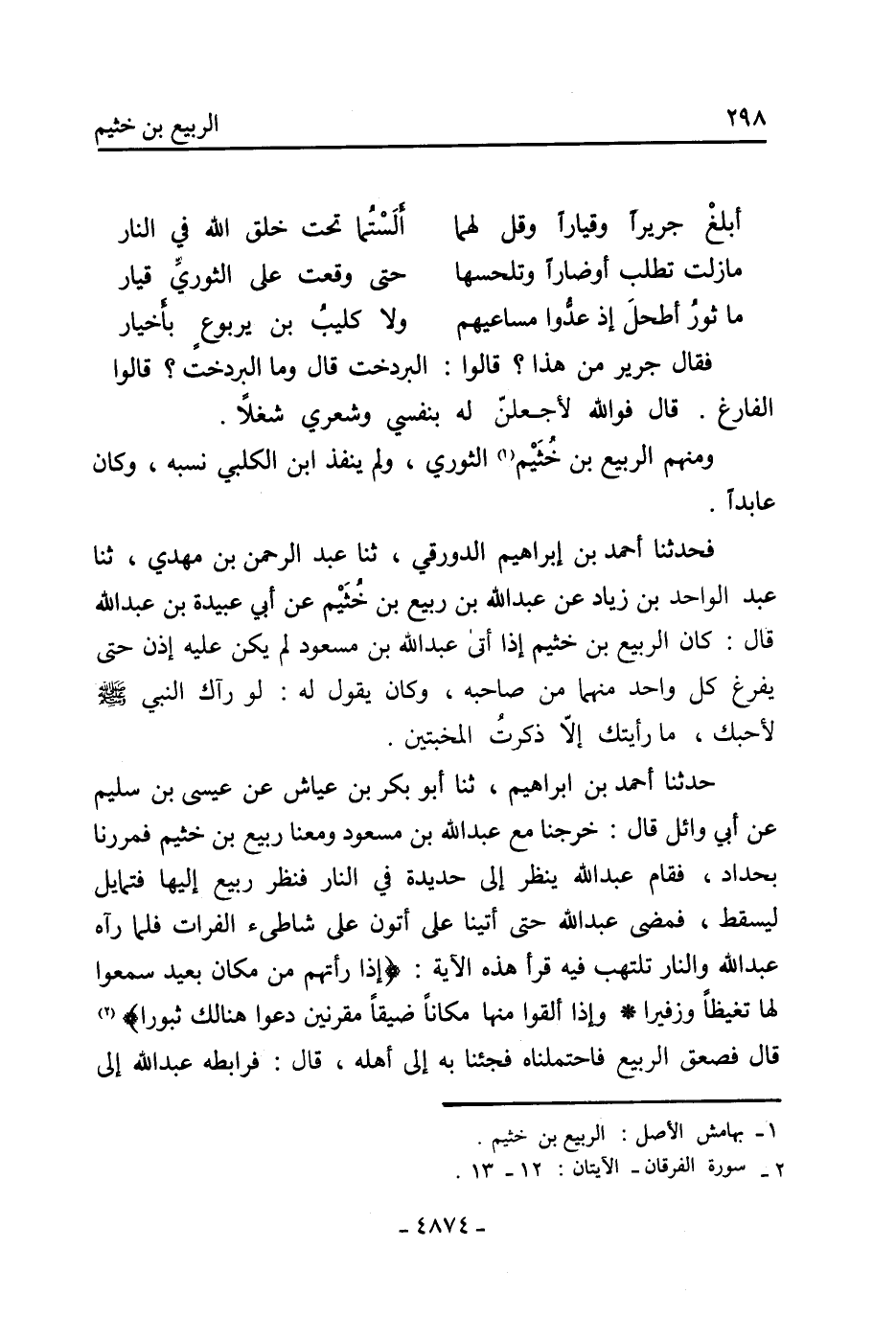 حَدَّثَنَا أحمد بن إبراهيم، ثنا أبو بكر بن عَيَّاشٍ عَنْ عِيسَى بْنِ سُلَيْمٍ عَنْ أَبِي وَائِلٍ قَالَ: خَرَجْنَا مَعَ عَبْدِ اللَّهِ بْنِ مَسْعُودٍ وَمَعَنَا رَبِيعُ بْنُ خُثَيْمٍ فَمَرَرْنَا بِحَدَّادٍ، فَقَامَ عَبْدُ اللَّهِ يَنْظُرُ إِلَى حَدِيدَةٍ فِي النَّارِ فَنَظَرَ رَبِيعٌ إِلَيْهَا فَتَمَايَلَ لِيَسْقُطَ، فَمَضَى عَبْدُ اللَّهِ حَتَّى أَتَيْنَا عَلَى أَتُّونٍ عَلَى شَاطِئِ الْفُرَاتِ فَلَمَّا رَآهُ عَبْدُ اللَّهِ وَالنَّارُ تَلْتَهِبُ فِيهِ قَرَأَ هَذِهِ الآيَةَ: إِذَا رَأَتْهُمْ مِنْ مَكَانٍ بَعِيدٍ سَمِعُوا لَهَا تَغَيُّظًا وَزَفِيرًا وَإِذَا أُلْقُوا مِنْهَا مَكَانًا ضَيِّقًا مُقَرَّنِينَ دَعَوْا هنالك ثبورا [2] قَالَ فَصُعِقَ الرَّبِيعُ فَاحْتَمَلْنَاهُ فَجِئْنَا بِهِ إِلَى أهله، قال: فرابطه عبد الله إلى