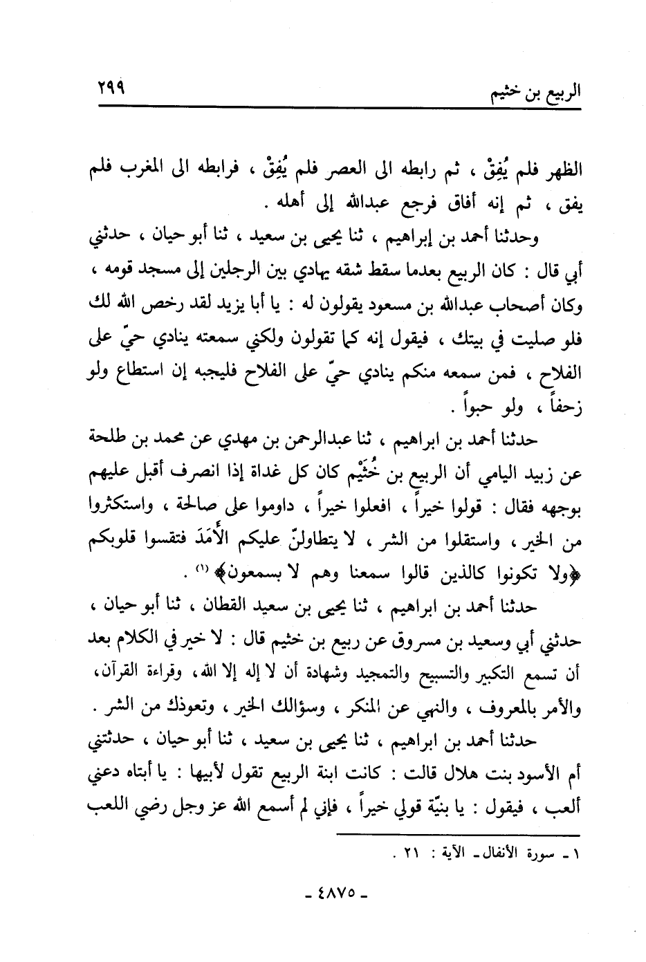 وحدثنا أحمد بن إبراهيم، ثنا يحيى بن سعيد، ثنا أبو حيان، حدثني أبي قال: كان الربيع بعد ما سقط شقه يهادي بين الرجلين إلى مسجد قومه، وكان أصحاب عبد الله بن مسعود يقولون له: يا أبا يزيد لقد رخص الله لك فلو صليت في بيتك، فيقول إنه كما تقولون ولكني سمعته ينادي حي على الفلاح، فمن سمعه منكم ينادي حي على الفلاح فليجبه إن استطاع ولو زحفا، ولو حبوا.