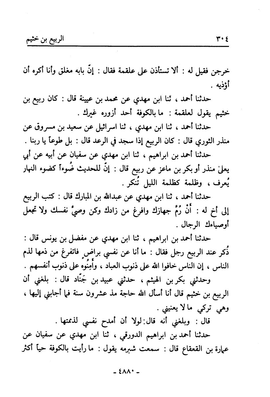 حدثنا أحمد، ثنا ابن مهدي عن محمد بن عيينة قال: كان ربيع بن خثيم يقول لعلقمة: ما بالكوفة أحد أزوره غيرك.