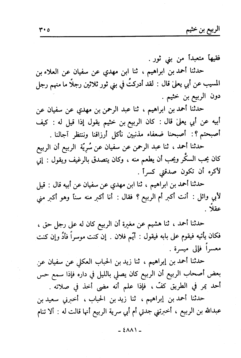 حدثنا أحمد بن إبراهيم، ثنا ابن مهدي عن سفيان عن العلاء بن المسيب عن أبي يعلى قال: لقد أدركت في بني ثور ثلاثين رجلا ما منهم رجل دون الربيع بن خثيم.