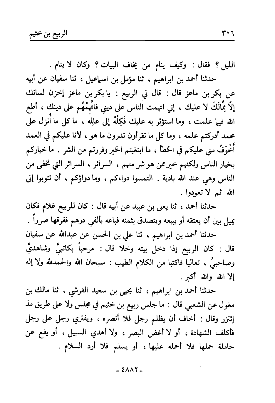 حدثنا أحمد بن إبراهيم، ثنا يحيى بن سعيد القرشي، ثنا مَالِكُ بْنُ مِغْوَلٍ عَنِ الشَّعْبِيِّ قَالَ: ما جلس ربيع بن خثيم في مجلس ولا على طريق مذ ائتزر وقال: أخاف أن يظلم رجل فلا أنصره، ويفتري رجل على رجل فأكلف الشهادة، أو لا أغض البصر، ولا أهدي السبيل، أو يقع عن حاملة حملها فلا أحمله عليها، أو يسلم فلا أرد السلام.
