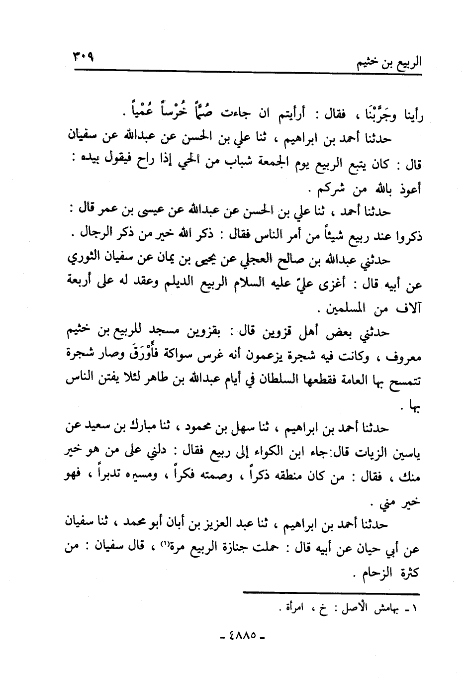 حدثنا أحمد بن إبراهيم، ثنا عبد العزيز بن أبان أبو محمد، ثنا سفيان عن أبي حيان عن أبيه قال: حملت جنازة الربيع مرة [1] ، قال سفيان: من كثرة الزحام.