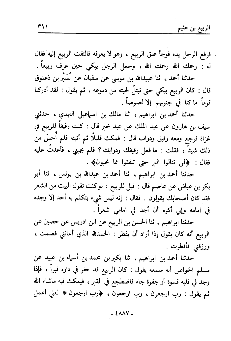 حدثنا أحمد بن إبراهيم، ثنا بكير بن محمد بن أسماء بن عبيد عن مسلم الخواص أنه سمعه يقول: كان الربيع قد حفر في داره قبرا، فإذا وجد في قلبه قسوة أو جفوة جاء فاضطجع في القبر، فيمكث فيه ما شاء الله ثم يقول: رب ارجعون، رب ارجعون، رَبِّ ارْجِعُونِ. لَعَلِّي أعمل