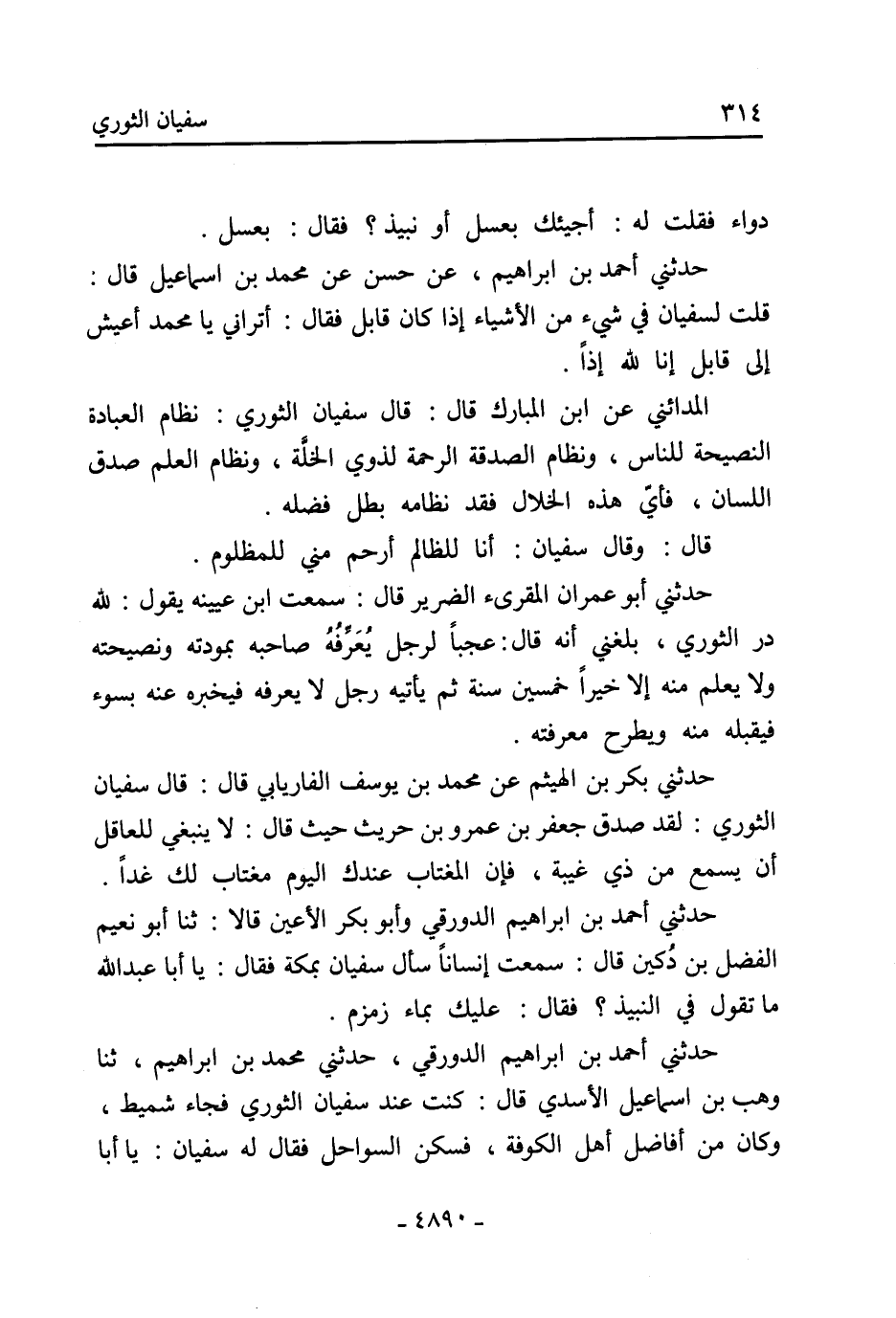 حدثني أحمد بن إبراهيم الدورقي وَأَبُو بَكْرٍ الأَعْيَنُ قَالا: ثنا أَبُو نُعَيْمٍ الفضل بن دكين قال: سمعت إنسانا سأل سفيان بمكة فقال: يا أبا عبد الله ما تقول في النبيذ؟ فقال: عليك بماء زمزم.