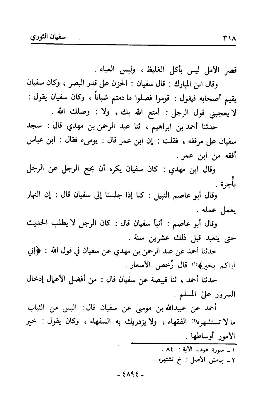 أحمد عن عبيد الله بن موسى عن سفيان قال: البس من الثياب ما لا تستشهره [2] الفقهاء، ولا يزدريك به السفهاء، وكان يقول: خير الأمور أوساطها.
