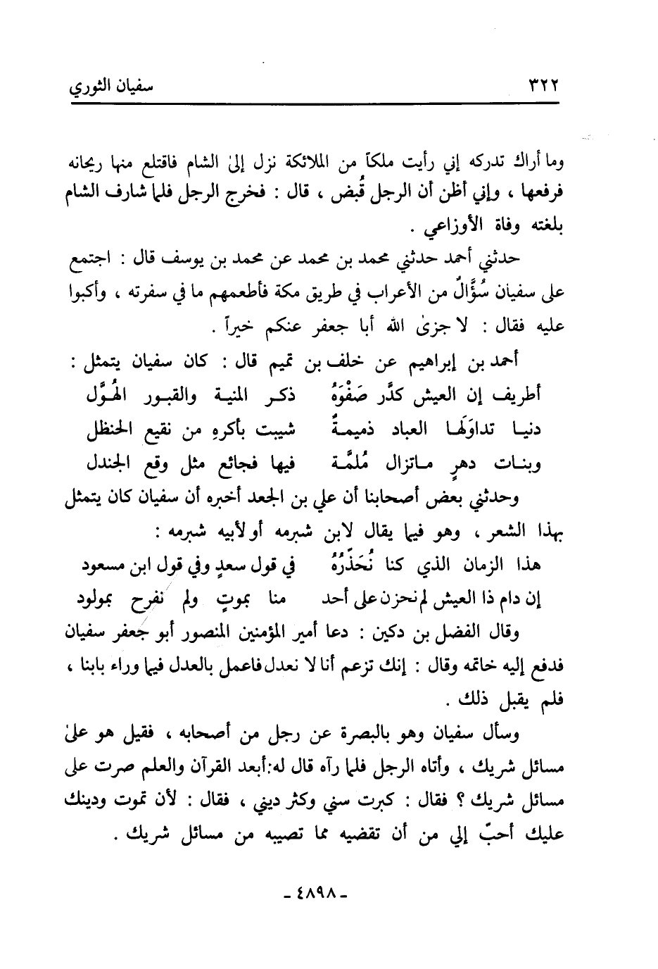وحدثني بعض أصحابنا أن علي بن الجعد أخبره أن سفيان كان يتمثل بهذا الشعر، وهو فيما يقال لابن شبرمة أو لأبيه شبرمه: