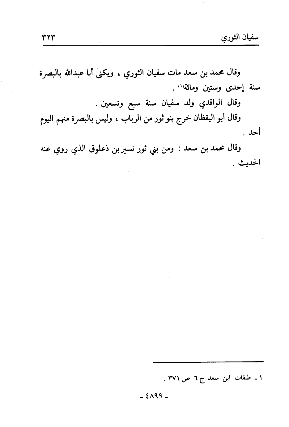 وقال محمد بن سعد مات سفيان الثوري، ويكنى أبا عبد الله بالبصرة سنة إحدى وستين ومائة [1] .