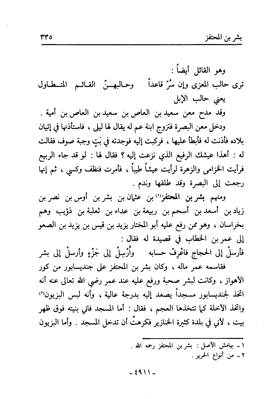 فقاسمه عمر ماله، وكان بشر بن المحتفز على جنديسابور من كور الأهواز، وكانت لبشر صحبة ورفع عليه عند عمر رضي الله تعالى عنه أنه اتخذ لجنديسابور مسجدا يصعد إليه بدرجة عالية، وأنه لبس البزيون [2] واتخذ الأخلة كما تتخذها العجم، فقال: أما المسجد فإني بنيته فوق ظهر بيت، لأني في بلدة كثيرة الخنازير فكرهت أن تدخل المسجد. وأما البزيون