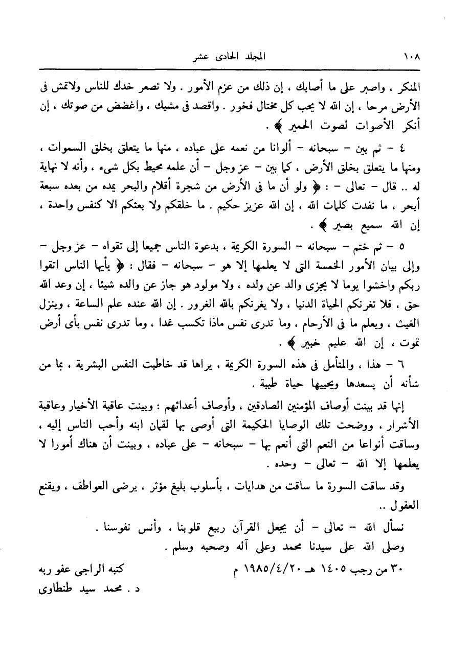 5- ثم ختم- سبحانه- السورة الكريمة، بدعوة الناس جميعا إلى تقواه- عز وجل- وإلى بيان الأمور الخمسة التي لا يعلمها إلا هو- سبحانه- فقال: يا أَيُّهَا النَّاسُ اتَّقُوا رَبَّكُمْ وَاخْشَوْا يَوْماً لا يَجْزِي والِدٌ عَنْ وَلَدِهِ، وَلا مَوْلُودٌ هُوَ جازٍ عَنْ والِدِهِ شَيْئاً، إِنَّ وَعْدَ اللَّهِ حَقٌّ، فَلا تَغُرَّنَّكُمُ الْحَياةُ الدُّنْيا، وَلا يَغُرَّنَّكُمْ بِاللَّهِ الْغَرُورُ. إِنَّ اللَّهَ عِنْدَهُ عِلْمُ السَّاعَةِ، وَيُنَزِّلُ الْغَيْثَ، وَيَعْلَمُ ما فِي الْأَرْحامِ، وَما تَدْرِي نَفْسٌ ماذا تَكْسِبُ غَداً، وَما تَدْرِي نَفْسٌ بِأَيِّ أَرْضٍ تَمُوتُ، إِنَّ اللَّهَ عَلِيمٌ خَبِيرٌ.