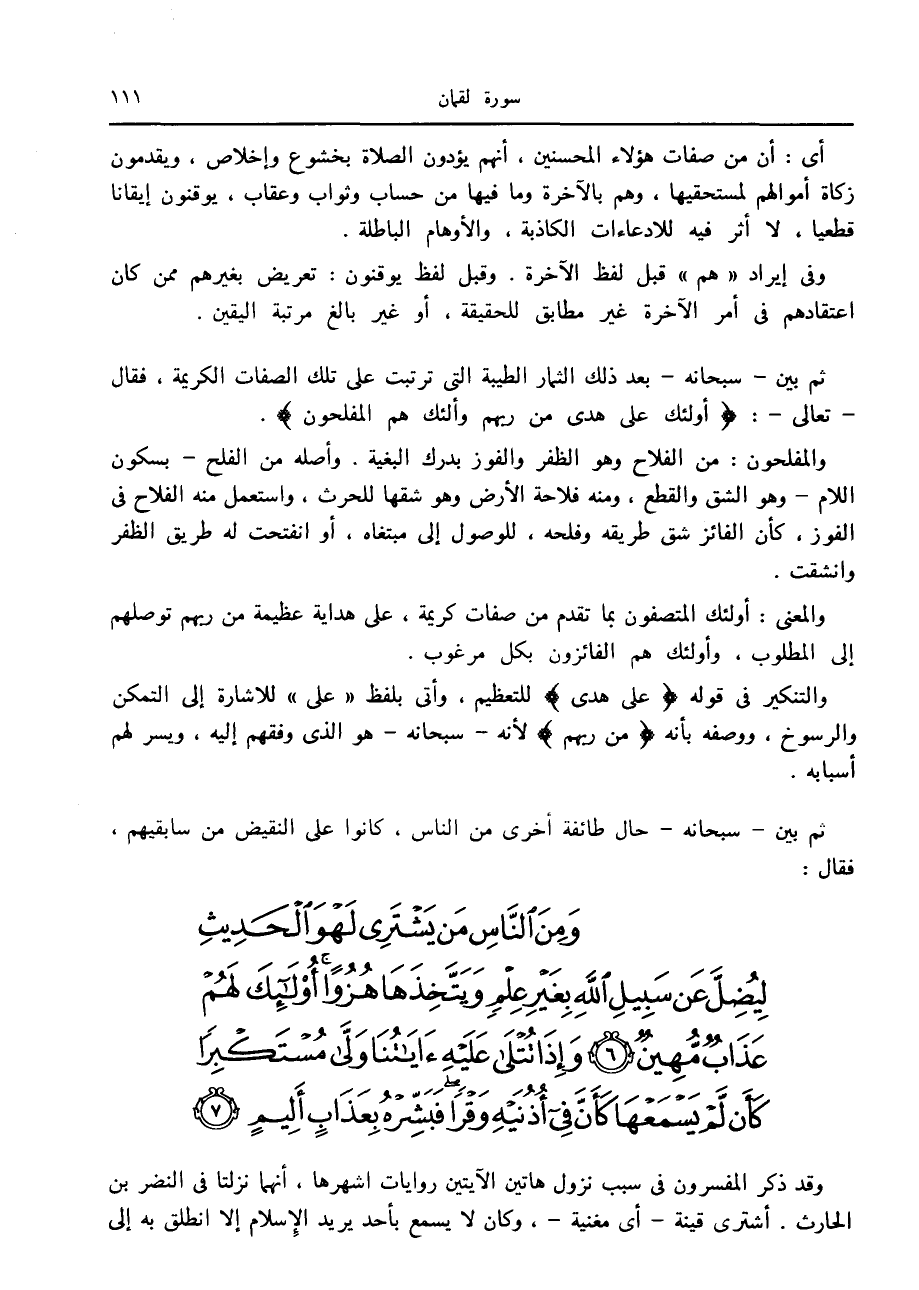 وَمِنَ النَّاسِ مَنْ يَشْتَرِي لَهْوَ الْحَدِيثِ لِيُضِلَّ عَنْ سَبِيلِ اللَّهِ بِغَيْرِ عِلْمٍ وَيَتَّخِذَها هُزُواً أُولئِكَ لَهُمْ عَذابٌ مُهِينٌ (6) وَإِذا تُتْلى عَلَيْهِ آياتُنا وَلَّى مُسْتَكْبِراً كَأَنْ لَمْ يَسْمَعْها كَأَنَّ فِي أُذُنَيْهِ وَقْراً فَبَشِّرْهُ بِعَذابٍ أَلِيمٍ (7)