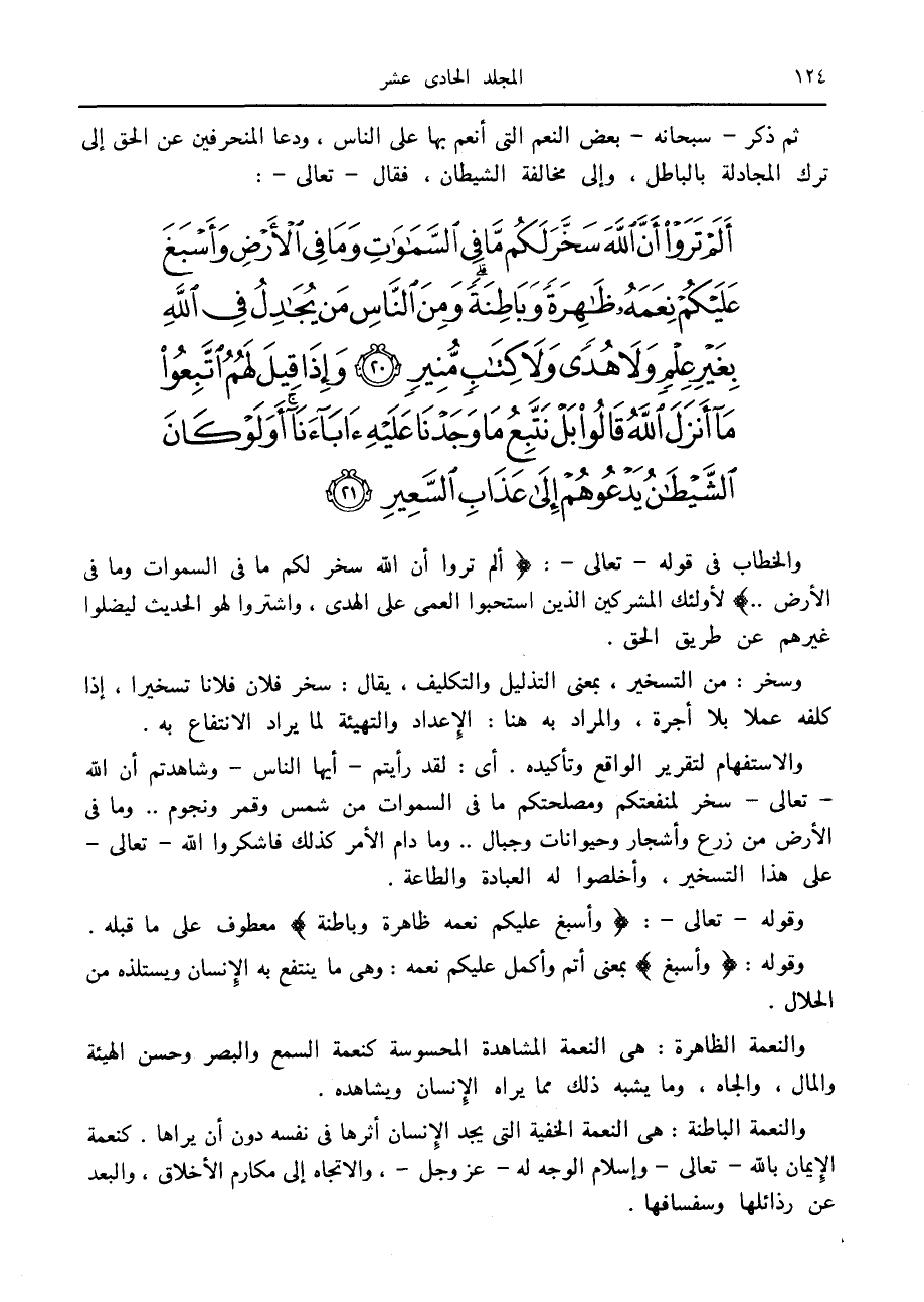 أَلَمْ تَرَوْا أَنَّ اللَّهَ سَخَّرَ لَكُمْ ما فِي السَّماواتِ وَما فِي الْأَرْضِ وَأَسْبَغَ عَلَيْكُمْ نِعَمَهُ ظاهِرَةً وَباطِنَةً وَمِنَ النَّاسِ مَنْ يُجادِلُ فِي اللَّهِ بِغَيْرِ عِلْمٍ وَلا هُدىً وَلا كِتابٍ مُنِيرٍ (20) وَإِذا قِيلَ لَهُمُ اتَّبِعُوا ما أَنْزَلَ اللَّهُ قالُوا بَلْ نَتَّبِعُ ما وَجَدْنا عَلَيْهِ آباءَنا أَوَلَوْ كانَ الشَّيْطانُ يَدْعُوهُمْ إِلى عَذابِ السَّعِيرِ (21)