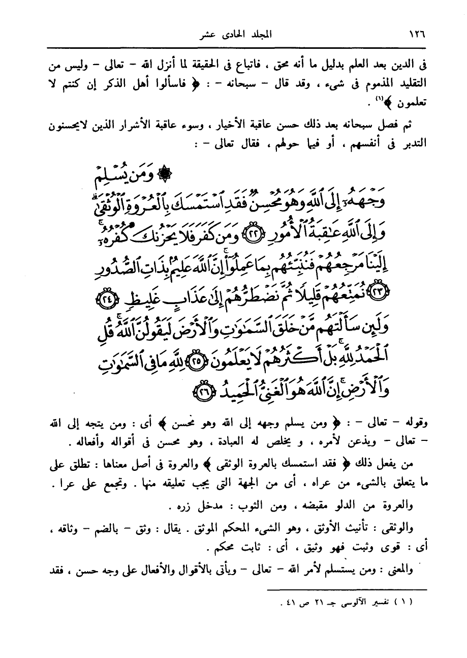 وَمَنْ يُسْلِمْ وَجْهَهُ إِلَى اللَّهِ وَهُوَ مُحْسِنٌ فَقَدِ اسْتَمْسَكَ بِالْعُرْوَةِ الْوُثْقى وَإِلَى اللَّهِ عاقِبَةُ الْأُمُورِ (22) وَمَنْ كَفَرَ فَلا يَحْزُنْكَ كُفْرُهُ إِلَيْنا مَرْجِعُهُمْ فَنُنَبِّئُهُمْ بِما عَمِلُوا إِنَّ اللَّهَ عَلِيمٌ بِذاتِ الصُّدُورِ (23) نُمَتِّعُهُمْ قَلِيلاً ثُمَّ نَضْطَرُّهُمْ إِلى عَذابٍ غَلِيظٍ (24) وَلَئِنْ سَأَلْتَهُمْ مَنْ خَلَقَ السَّماواتِ وَالْأَرْضَ لَيَقُولُنَّ اللَّهُ قُلِ الْحَمْدُ لِلَّهِ بَلْ أَكْثَرُهُمْ لا يَعْلَمُونَ (25) لِلَّهِ ما فِي السَّماواتِ وَالْأَرْضِ إِنَّ اللَّهَ هُوَ الْغَنِيُّ الْحَمِيدُ (26)
