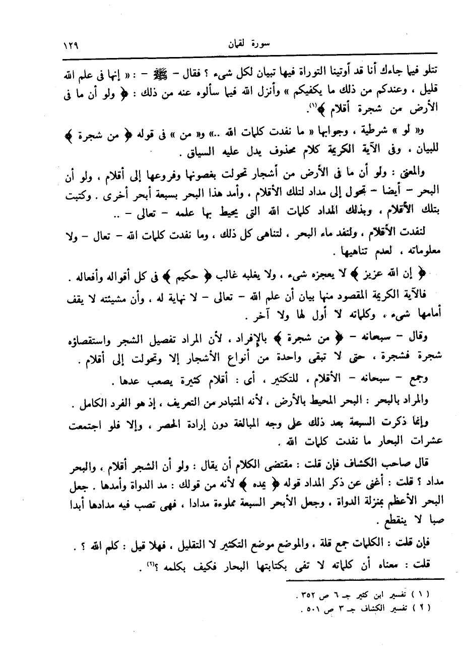 و «لو» شرطية، وجوابها «ما نفدت كلمات الله..» و «من» في قوله مِنْ شَجَرَةٍ للبيان، وفي الآية الكريمة كلام محذوف يدل عليه السياق.