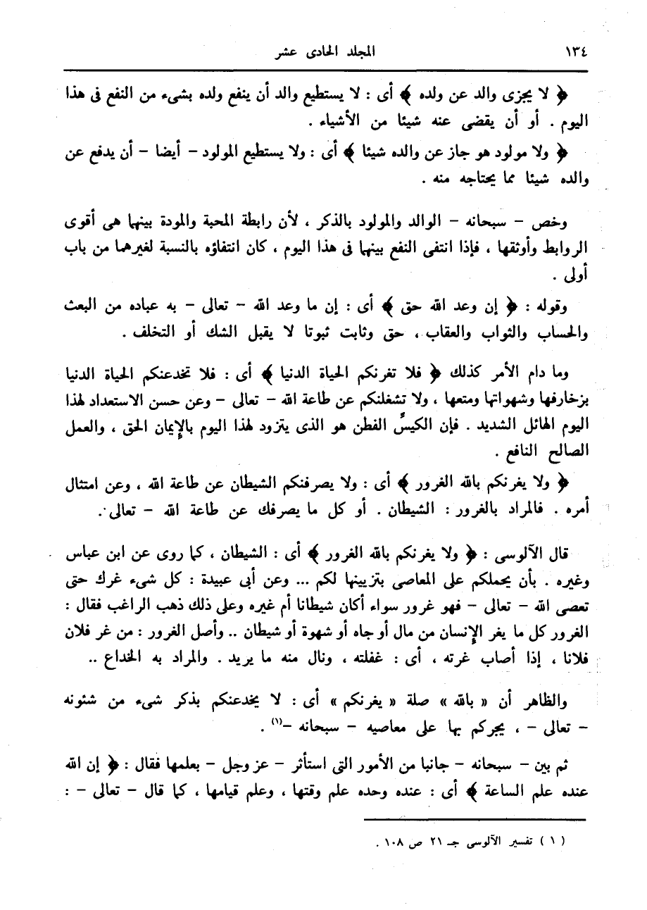 وَلا مَوْلُودٌ هُوَ جازٍ عَنْ والِدِهِ شَيْئاً أى: ولا يستطيع المولود- أيضا- أن يدفع عن والده شيئا مما يحتاجه منه.