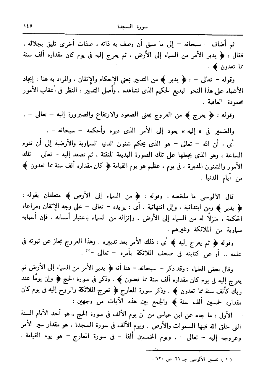 وقال بعض العلماء: وقد ذكر- سبحانه- هنا أنه يُدَبِّرُ الْأَمْرَ مِنَ السَّماءِ إِلَى الْأَرْضِ ثُمَّ يَعْرُجُ إِلَيْهِ فِي يَوْمٍ كانَ مِقْدارُهُ أَلْفَ سَنَةٍ مِمَّا تَعُدُّونَ. وذكر في سورة الحج وَإِنَّ يَوْماً عِنْدَ رَبِّكَ كَأَلْفِ سَنَةٍ مِمَّا تَعُدُّونَ. وذكر في سورة المعارج تَعْرُجُ الْمَلائِكَةُ وَالرُّوحُ إِلَيْهِ فِي يَوْمٍ كانَ مِقْدارُهُ خَمْسِينَ أَلْفَ سَنَةٍ والجمع بين هذه الآيات من وجهين: