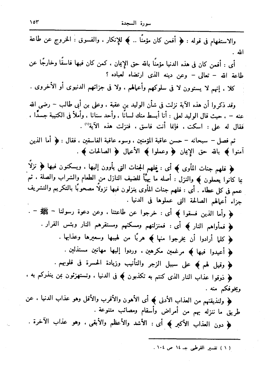 والاستفهام في قوله: أَفَمَنْ كانَ مُؤْمِناً.. للإنكار، والفسوق: الخروج عن طاعة الله.