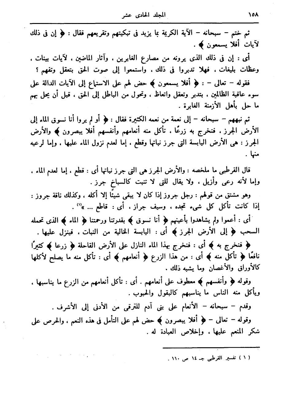 ثم نبههم- سبحانه- إلى نعمة من نعمه الكثيرة فقال: أَوَلَمْ يَرَوْا أَنَّا نَسُوقُ الْماءَ إِلَى الْأَرْضِ الْجُرُزِ، فَنُخْرِجُ بِهِ زَرْعاً، تَأْكُلُ مِنْهُ أَنْعامُهُمْ وَأَنْفُسُهُمْ أَفَلا يُبْصِرُونَ والأرض الجرز: هي الأرض اليابسة التي جرز نباتها وقطع، إما لعدم نزول الماء عليها، وإما لرعيه منها.