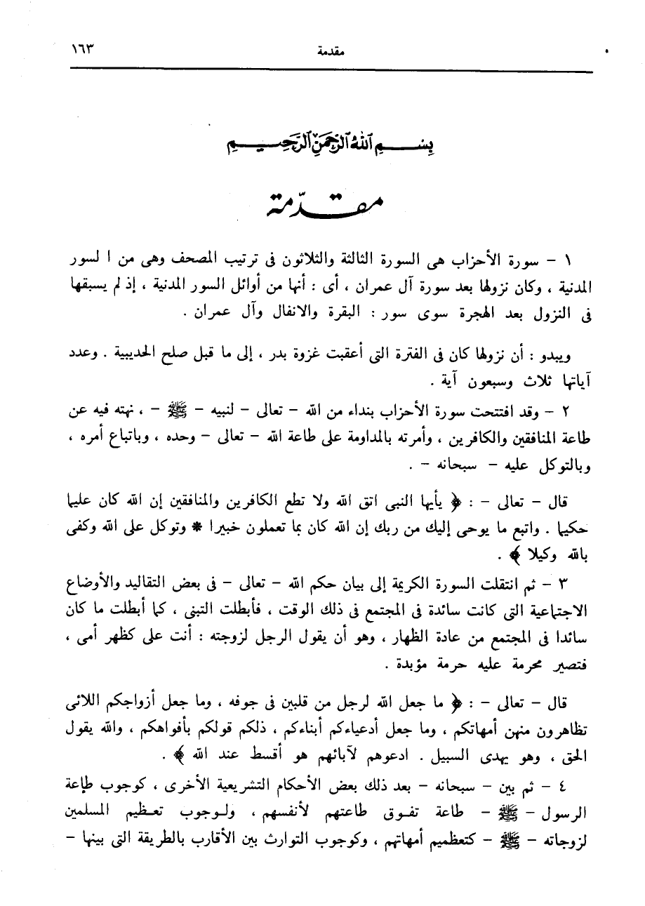 1- سورة الأحزاب هي السورة الثالثة والثلاثون في ترتيب المصحف وهي من السور المدنية، وكان نزولها بعد سورة آل عمران، أى: أنها من أوائل السور المدنية، إذ لم يسبقها في النزول بعد الهجرة سوى سور: البقرة والأنفال وآل عمران.
