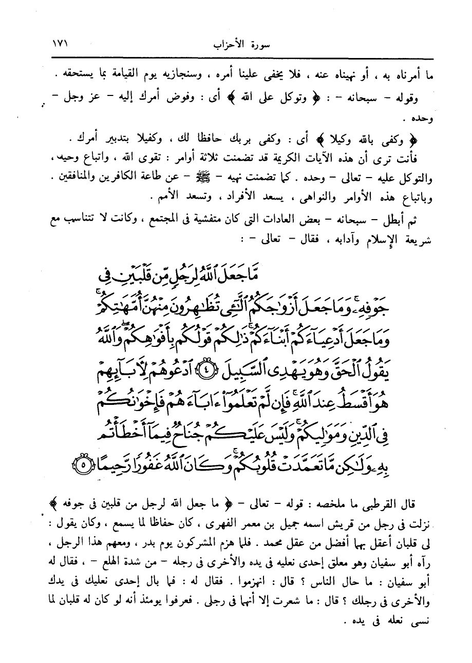 ما جَعَلَ اللَّهُ لِرَجُلٍ مِنْ قَلْبَيْنِ فِي جَوْفِهِ وَما جَعَلَ أَزْواجَكُمُ اللاَّئِي تُظاهِرُونَ مِنْهُنَّ أُمَّهاتِكُمْ وَما جَعَلَ أَدْعِياءَكُمْ أَبْناءَكُمْ ذلِكُمْ قَوْلُكُمْ بِأَفْواهِكُمْ وَاللَّهُ يَقُولُ الْحَقَّ وَهُوَ يَهْدِي السَّبِيلَ (4) ادْعُوهُمْ لِآبائِهِمْ هُوَ أَقْسَطُ عِنْدَ اللَّهِ فَإِنْ لَمْ تَعْلَمُوا آباءَهُمْ فَإِخْوانُكُمْ فِي الدِّينِ وَمَوالِيكُمْ وَلَيْسَ عَلَيْكُمْ جُناحٌ فِيما أَخْطَأْتُمْ بِهِ وَلكِنْ ما تَعَمَّدَتْ قُلُوبُكُمْ وَكانَ اللَّهُ غَفُوراً رَحِيماً (5)