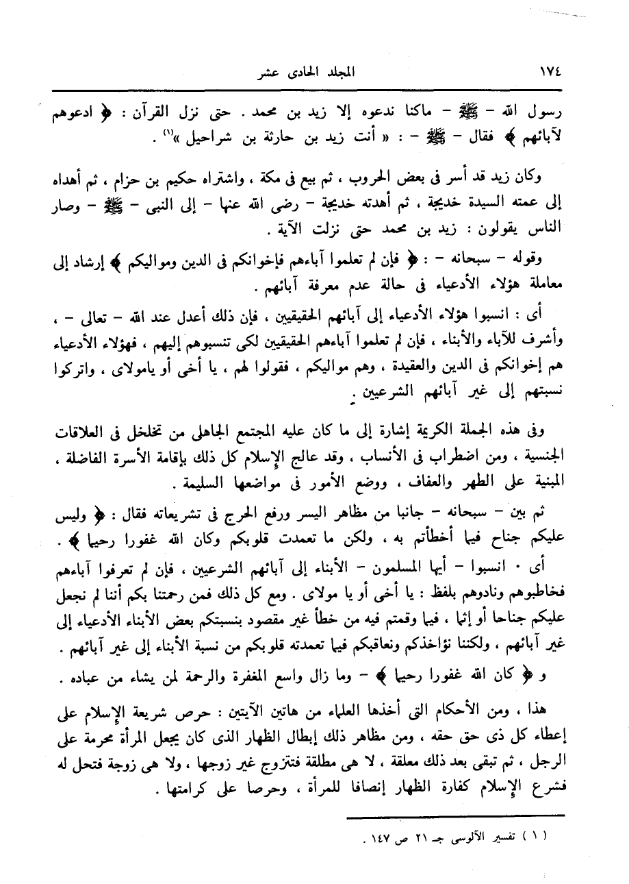 رسول الله صلّى الله عليه وسلّم ما كنا ندعوه إلا زيد بن محمد. حتى نزل القرآن: ادْعُوهُمْ لِآبائِهِمْ فقال صلّى الله عليه وسلم: «أنت زيد بن حارثة بن شراحيل» «1» .