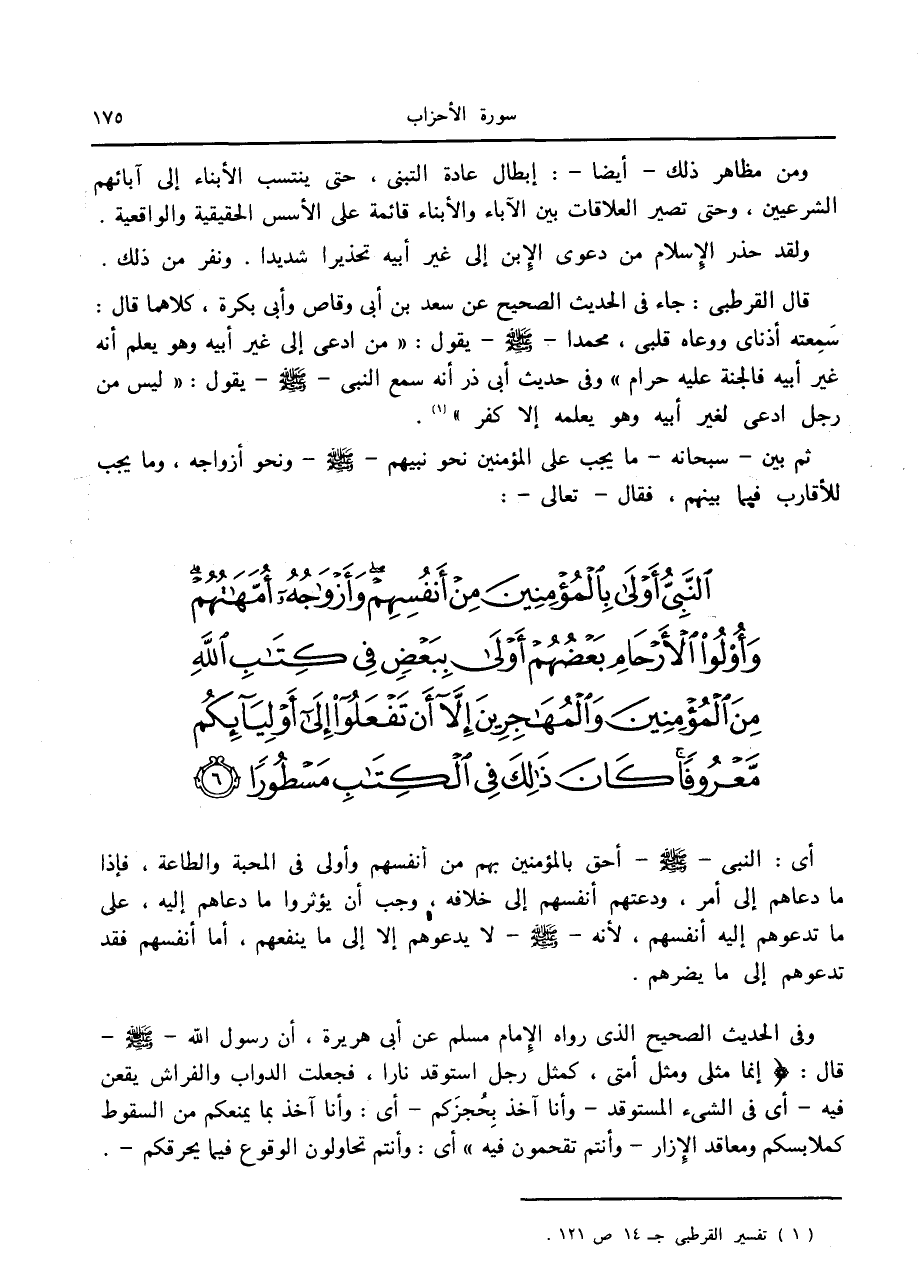 النَّبِيُّ أَوْلى بِالْمُؤْمِنِينَ مِنْ أَنْفُسِهِمْ وَأَزْواجُهُ أُمَّهاتُهُمْ وَأُولُوا الْأَرْحامِ بَعْضُهُمْ أَوْلى بِبَعْضٍ فِي كِتابِ اللَّهِ مِنَ الْمُؤْمِنِينَ وَالْمُهاجِرِينَ إِلاَّ أَنْ تَفْعَلُوا إِلى أَوْلِيائِكُمْ مَعْرُوفاً كانَ ذلِكَ فِي الْكِتابِ مَسْطُوراً (6)