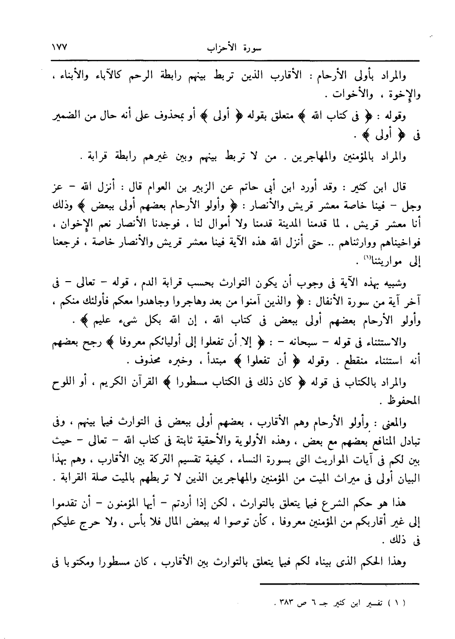 قال ابن كثير: وقد أورد ابن أبى حاتم عن الزبير بن العوام قال: أنزل الله- عز وجل- فينا خاصة معشر قريش والأنصار: وَأُولُوا الْأَرْحامِ بَعْضُهُمْ أَوْلى بِبَعْضٍ وذلك أنا معشر قريش، لما قدمنا المدينة قدمنا ولا أموال لنا، فوجدنا الأنصار نعم الإخوان، فواخيناهم ووارثناهم ... حتى أنزل الله هذه الآية فينا معشر قريش والأنصار خاصة، فرجعنا إلى مواريثنا «1» .