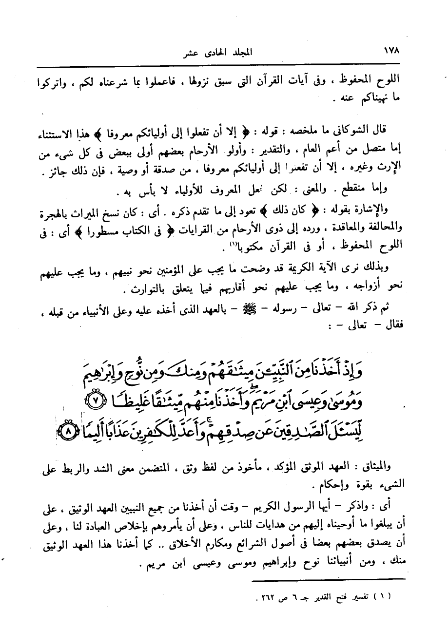 وَإِذْ أَخَذْنا مِنَ النَّبِيِّينَ مِيثاقَهُمْ وَمِنْكَ وَمِنْ نُوحٍ وَإِبْراهِيمَ وَمُوسى وَعِيسَى ابْنِ مَرْيَمَ وَأَخَذْنا مِنْهُمْ مِيثاقاً غَلِيظاً (7) لِيَسْئَلَ الصَّادِقِينَ عَنْ صِدْقِهِمْ وَأَعَدَّ لِلْكافِرِينَ عَذاباً أَلِيماً (8)