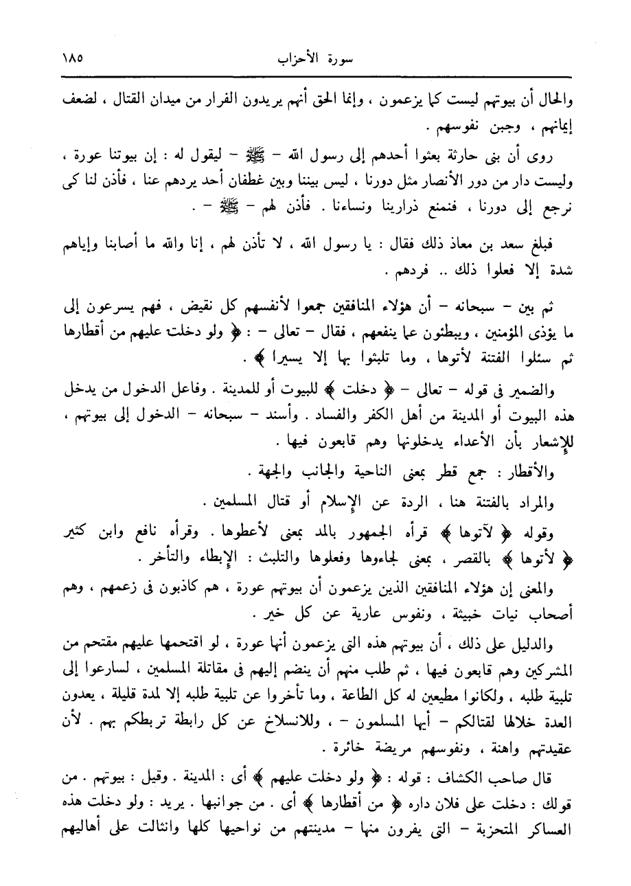 والدليل على ذلك، أن بيوتهم هذه التي يزعمون أنها عورة، لو اقتحمها عليهم مقتحم من المشركين وهم قابعون فيها، ثم طلب منهم أن ينضم إليهم في مقاتلة المسلمين، لسارعوا إلى تلبية طلبه، ولكانوا مطيعين له كل الطاعة، وما تأخروا عن تلبية طلبه إلا لمدة قليلة، يعدون العدة خلالها لقتالكم- أيها المسلمون-، وللانسلاخ عن كل رابطة تربطكم بهم. لأن عقيدتهم واهنة، ونفوسهم مريضة خائرة.