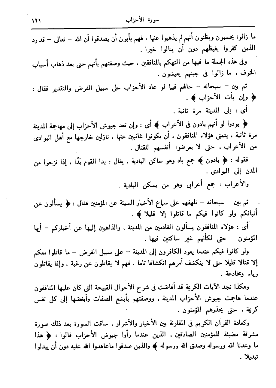 وهكذا نجد الآيات الكريمة قد أفاضت في شرح الأحوال القبيحة التي كان عليها المنافقون عند ما هاجمت جيوش الأحزاب المدينة، ووصفتهم بأبشع الصفات وأبغضها إلى كل نفس كريمة، حتى يحذرهم المؤمنون.