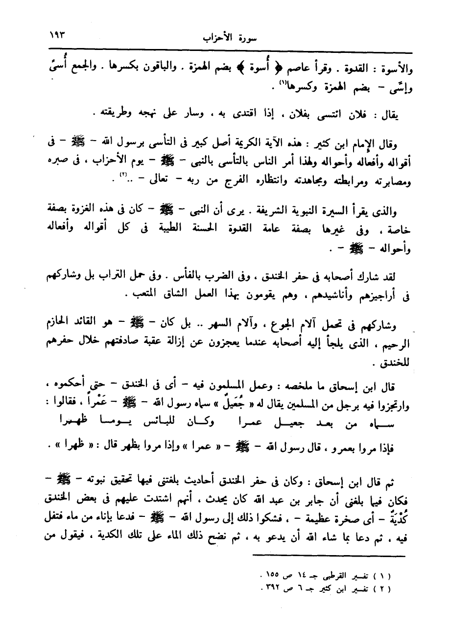 وقال الإمام ابن كثير: هذه الآية الكريمة أصل كبير في التأسى برسول الله صلّى الله عليه وسلّم في أقواله وأفعاله وأحواله ولهذا أمر الناس بالتأسى بالنبي صلّى الله عليه وسلّم يوم الأحزاب، في صبره ومصابرته ومرابطته ومجاهدته وانتظاره الفرج من ربه- تعالى-.. «2» .