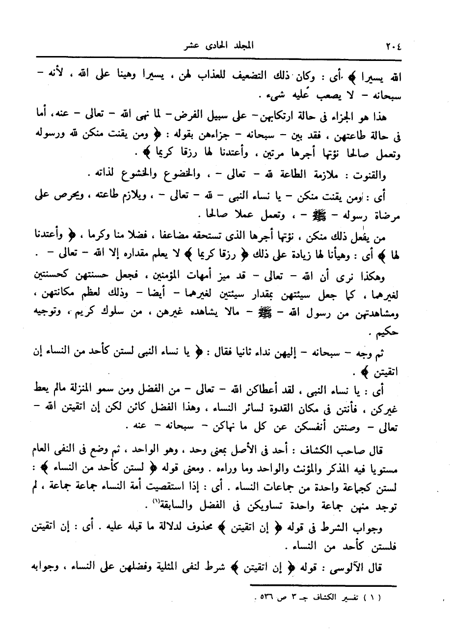 هذا هو الجزاء في حالة ارتكابهن- على سبيل الفرض- لما نهى الله- تعالى- عنه، أما في حالة طاعتهن، فقد بين- سبحانه- جزاءهن بقوله: وَمَنْ يَقْنُتْ مِنْكُنَّ لِلَّهِ وَرَسُولِهِ وَتَعْمَلْ صالِحاً نُؤْتِها أَجْرَها مَرَّتَيْنِ، وَأَعْتَدْنا لَها رِزْقاً كَرِيماً.
