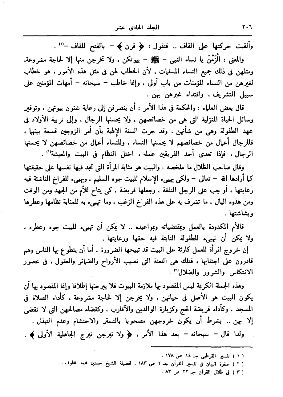 وهذه الجملة الكريمة ليس المقصود بها ملازمة البيوت فلا يبرحنها إطلاقا وإنما المقصود بها أن يكون البيت هو الأصل في حياتهن، ولا يخرجن إلا لحاجة مشروعة، كأداء الصلاة في المسجد، وكأداء فريضة الحج وكزيارة الوالدين والأقارب، وكقضاء مصالحهن التي لا تقضى إلا بهن.. بشرط أن يكون خروجهن مصحوبا بالتستر والاحتشام وعدم التبذل.