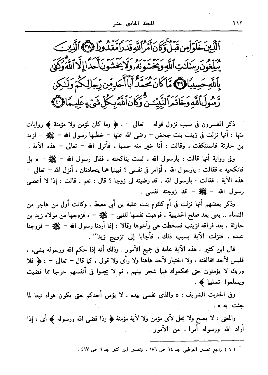 ذكر المفسرون في سبب نزول قوله- تعالى-: وَما كانَ لِمُؤْمِنٍ وَلا مُؤْمِنَةٍ روايات منها: أنها نزلت في زينب بنت جحش- رضى الله عنها- خطبها رسول الله صلّى الله عليه وسلّم لزيد ابن حارثة فاستنكفت، وقالت: أنا خير منه حسبا، فأنزل الله- تعالى- هذه الآية.