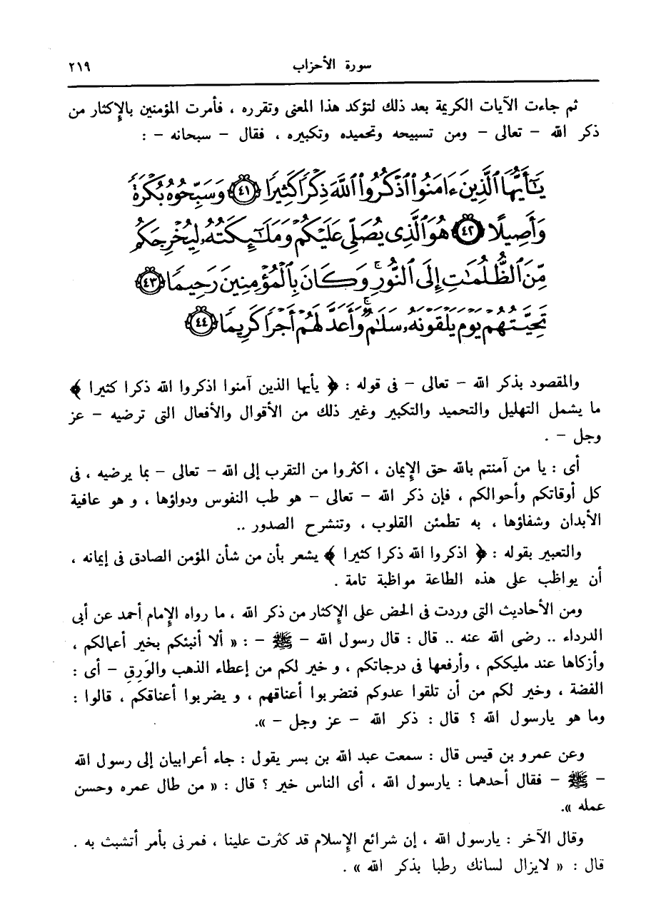 يا أَيُّهَا الَّذِينَ آمَنُوا اذْكُرُوا اللَّهَ ذِكْراً كَثِيراً (41) وَسَبِّحُوهُ بُكْرَةً وَأَصِيلاً (42) هُوَ الَّذِي يُصَلِّي عَلَيْكُمْ وَمَلائِكَتُهُ لِيُخْرِجَكُمْ مِنَ الظُّلُماتِ إِلَى النُّورِ وَكانَ بِالْمُؤْمِنِينَ رَحِيماً (43) تَحِيَّتُهُمْ يَوْمَ يَلْقَوْنَهُ سَلامٌ وَأَعَدَّ لَهُمْ أَجْراً كَرِيماً (44)