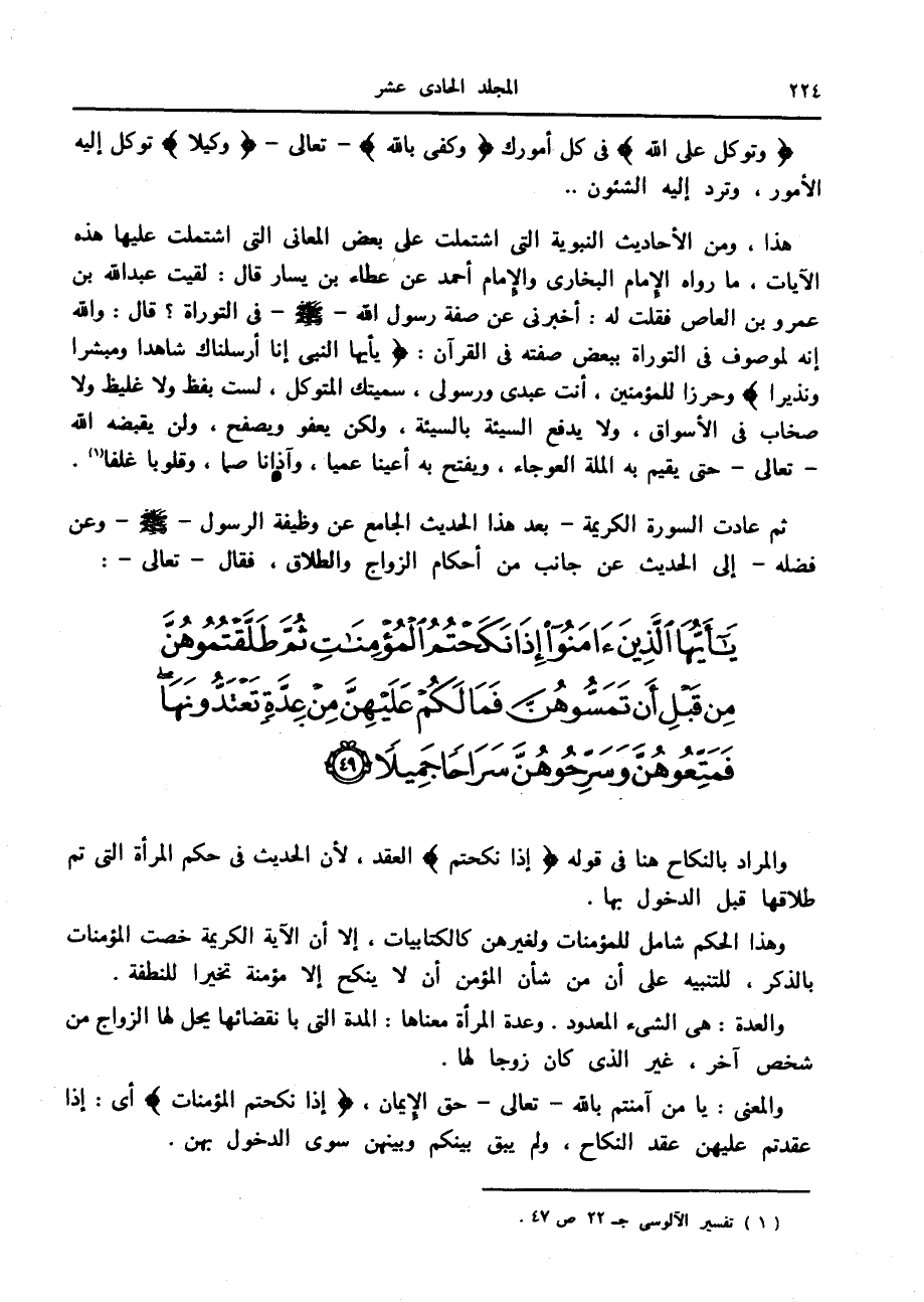 ثم عادت السورة الكريمة- بعد هذا الحديث الجامع عن وظيفة الرسول صلّى الله عليه وسلّم وعن فضله- إلى الحديث عن جانب من أحكام الزواج والطلاق، فقال- تعالى-:
