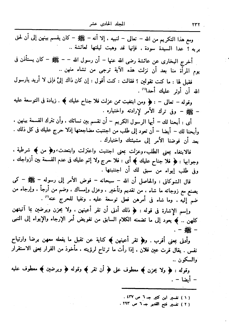 قال الشوكانى: والحاصل أن الله- سبحانه- فوض الأمر إلى رسوله صلّى الله عليه وسلّم كي يصنع مع زوجاته ما شاء، من تقديم وتأخير، وعزل وإمساك، وضم من أرجأ، وإرجاء من ضم إليه، وما شاء في أمرهن فعل توسعة عليه، ونفيا للحرج عنه «2» .