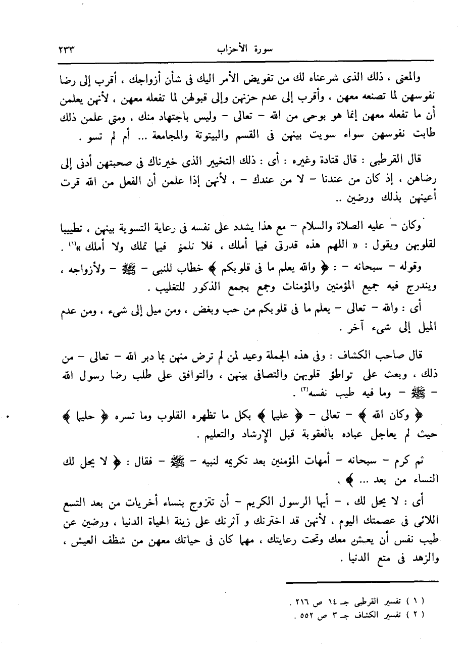 ثم كرم- سبحانه- أمهات المؤمنين بعد تكريمه لنبيه صلّى الله عليه وسلّم فقال: لا يَحِلُّ لَكَ النِّساءُ مِنْ بَعْدُ....