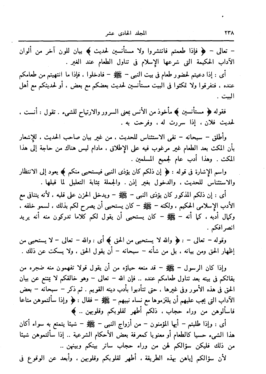 وأطلق- سبحانه- نفى الاستئناس للحديث، من غير بيان صاحب الحديث، للإشعار بأن المكث بعد الطعام غير مرغوب فيه على الإطلاق، مادام ليس هناك من حاجة إلى هذا المكث. وهذا أدب عام لجميع المسلمين.