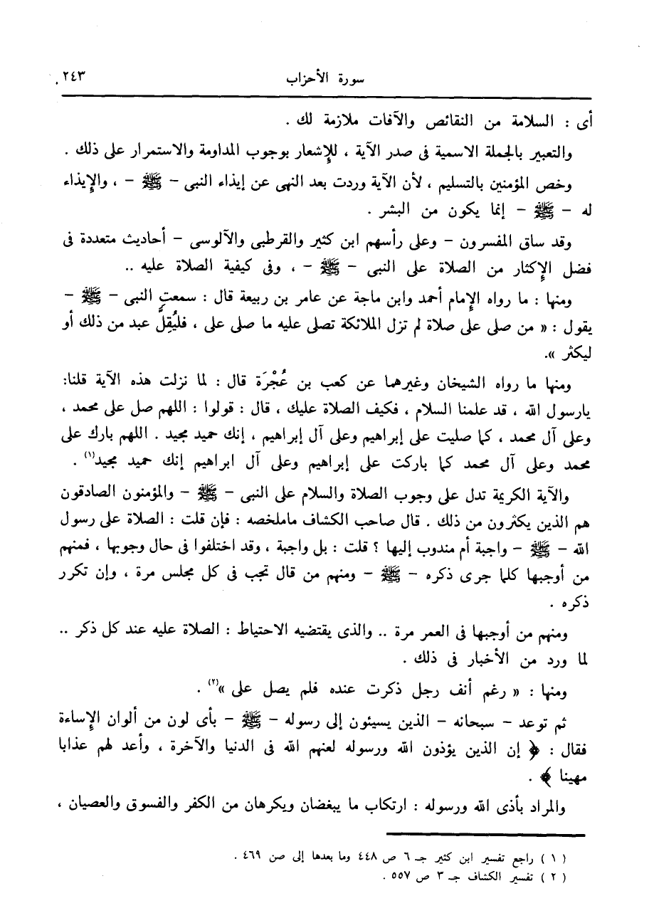 والآية الكريمة تدل على وجوب الصلاة والسلام على النبي صلّى الله عليه وسلّم والمؤمنون الصادقون هم الذين يكثرون من ذلك. قال صاحب الكشاف ما ملخصه: فإن قلت: الصلاة على رسول الله صلّى الله عليه وسلّم واجبة أم مندوب إليها؟ قلت: بل واجبة، وقد اختلفوا في حال وجوبها، فمنهم من أوجبها كلما جرى ذكره صلّى الله عليه وسلّم ومنهم من قال تجب في كل مجلس مرة، وإن تكرر ذكره.